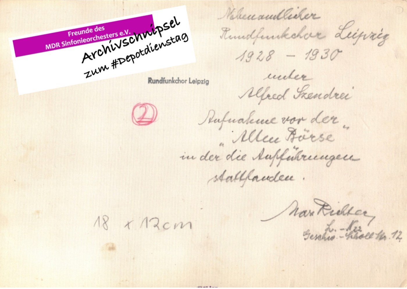Wir wollen hier keine Orchesterchronik ins Netz schreiben, sondern wollen im Blog vielmehr punktuell und magazinartig kleine Spotlights auf besondere Ereignisse setzen oder bei uns auftauchende Depotdinge zeigen, wenn es einen aktuellen Bezug dazu gibt. Wie die Zeitreisenden werden wir hier durch fast 100 Jahre Orchestergeschichte streifen, manches mal schon tauchten Fragen oder Anregungen auf unterschiedlichsten Wegen auf, die wir gern hier intensiver aufnehmen, so wie es unsere Zeit zulässt. Herr Koch schickte uns eine kleine Detektivgeschichte, die eng mit dem ersten Orchesterfoto verbunden ist, wir schrieben im ersten Archivschnipsel darüber. Diese dazugehörige Chor-Geschichte zeigt, wie mühsam es manchmal ist, Archivmaterial zu sichten.