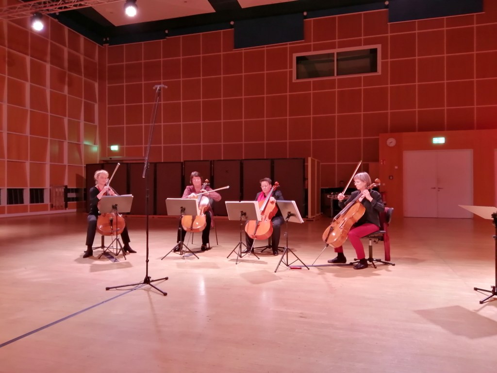 Vier Damen der Cellogruppe des MDR-Sinfonieorchesters, Sybille Hesselbarth, Anna Niebuhr, Susanne Rassbach und Beate Kunze sowie Moderator Axel Thielmann sorgten für einen vergnüglichen Abend, bei dem das Entree „Bel Ami“ von Axel Thielmann gesungen wurde. Gespielt wurde viel unterhaltsame Musik, von Mackeben, Raymond, Wagner, Schumann, Schubert, Telemann und weiteren bekannten Komponisten. Mir gefiel ja besonders der Titel „Mein Hund beißt jede hübsche Frau ins Bein“. Das ist doch ein Fall für die Haftpflicht!