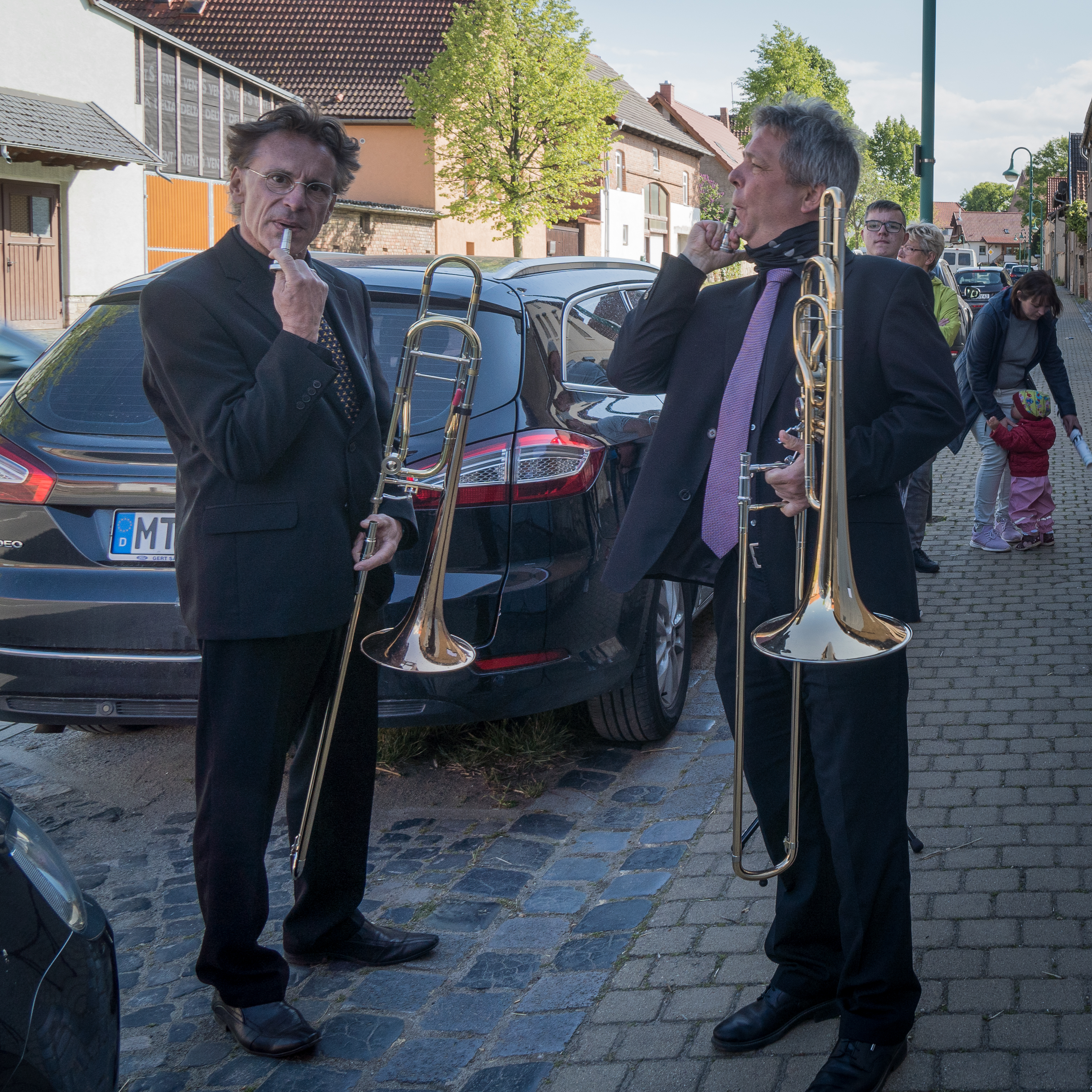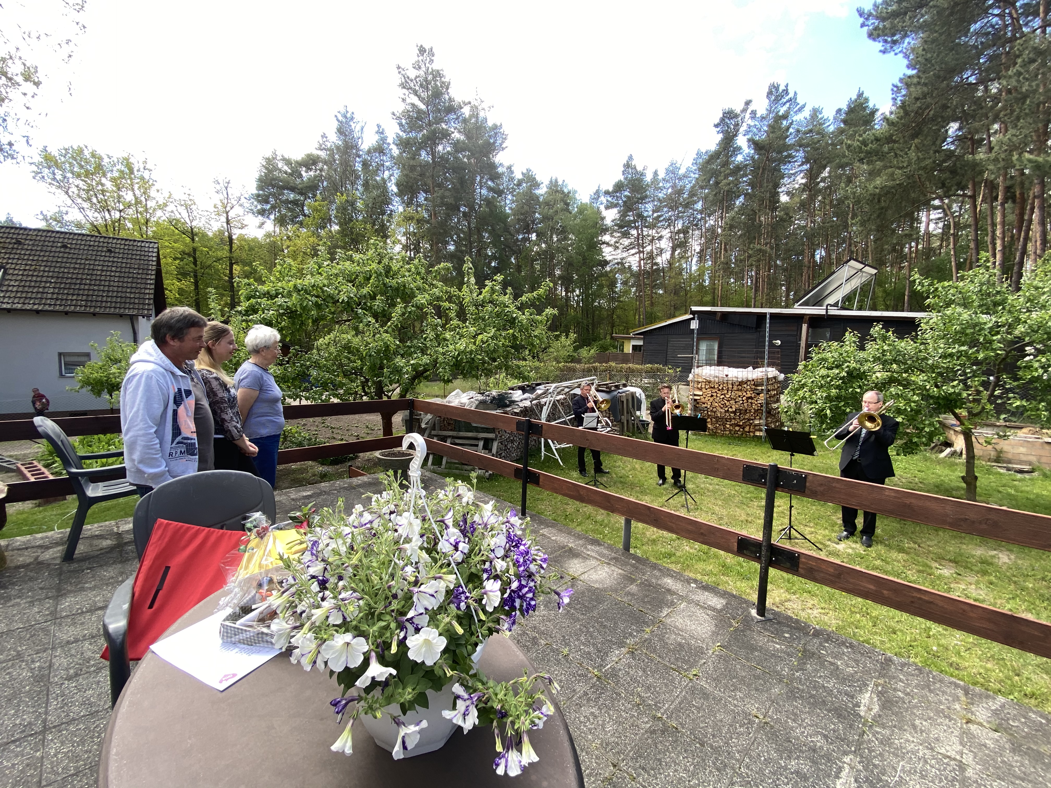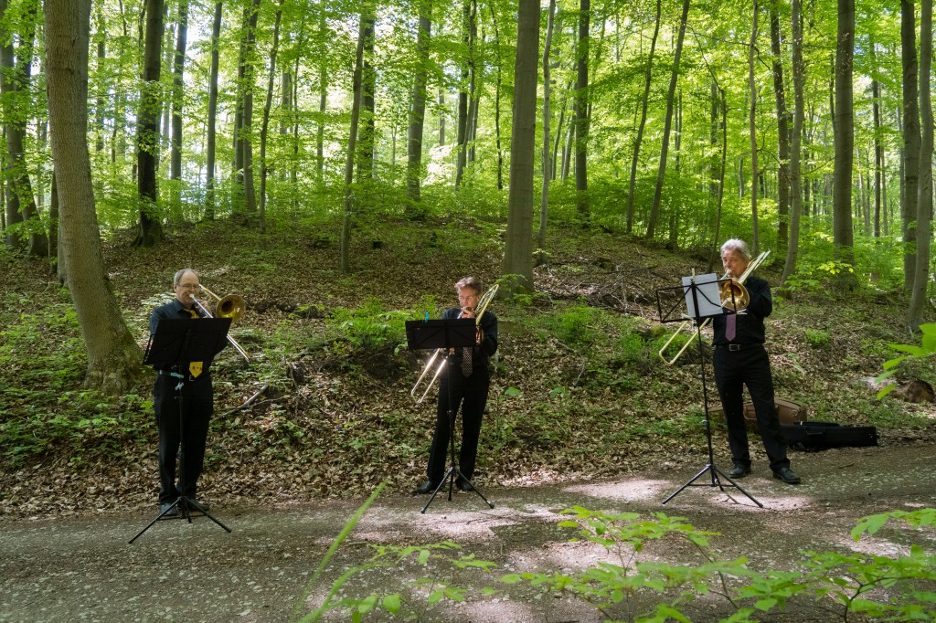 Am 08.05. hatten wir, also Uwe Gebel, Fernando Günther und Eckart Wiegräbe, um 10 Uhr einen „Lieder-Lieferdienst“ in Harztor bei Nordhausen. Eine Tochter bedankte sich durch uns bei ihren Eltern, die immer für ihre acht (!) Kinder und dreizehn (!) Enkelkinder da waren, obwohl ihr Vater gerade den Unterschenkel amputiert bekommen hat. Es war ein sehr berührender Auftritt, wie sich die Familie zu unserer Musik im Arm hielt. Der nächste Termin sollte bei einer Apotheke in Mühlhausen sein. Da wir noch etwas Zwischenzeit hatten, machten wir in einem Wald kurz vor Mühlhausen eine Pause. Nachdem wir einen Förster beruhigt hatten, konnten wir sogar eine Probe machen (siehe Foto oben) – denn wir passen unser Programm gerne ganz aktuell den Beschenkten an und erweitern es immer wieder.