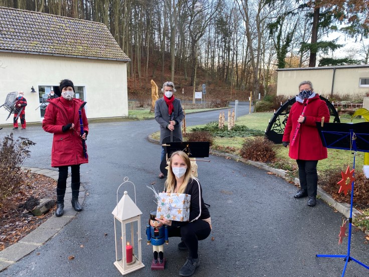Wir, zwei Flötistinnen und ein Cellist (Ute Günther und ich, Susanne Schneider, sowie Norbert Hilger) fuhren am 21.12.2020 los und brachten weihnachtliche Klänge als „Carbontrio“ nach Thüringen. Der kalte Morgen überraschte uns erst einmal mit spiegelglatten Straßen im Wald bei Bürgel, aber wir kamen unbeschadet an. Das Glatteis hatte keine Chance, der Cellostachel war gnadenlos und auch wir Flöten fanden rutschfesten Stand. Gewonnen hatte eine junge Altenpflegerin, die zugleich die Senioren des ASPIDA Lebenszentrum Thalbürgel beschenken, sie schrieb: