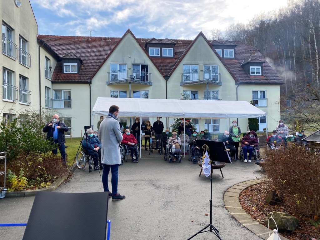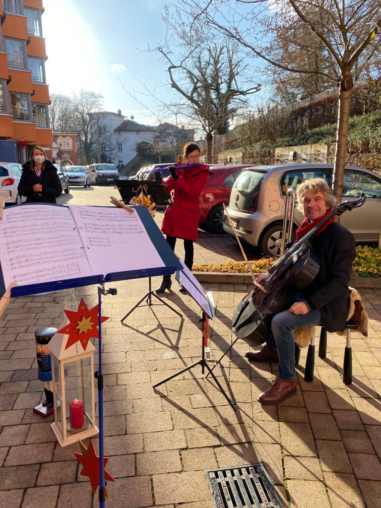 Einige rüstige Senioren ließen es sich nicht nehmen, im Garten an Feuerschalen, die der Hausmeister heranschaffte und befeuerte, Platz zu nehmen, viele lauschten aber auch an den Fenstern. Nachdem wir unsere Instrumente überreden konnten, sich auf einen gemeinsamen Kammerton zu einigen (die Celloseiten mussten sich in der Kälte erst ein wenig locker machen ;-), konnte es losgehen. Mit großem Abstand spielten wir weihnachtliche Musik. Bei den bekannten Liedern wurde erst leise mitgesummt, später laut gesungen, danach viel geklatscht. Strahlende Augen sahen wir über den Masken. Es war uns eine Freude, so viel Freude zu den Senioren zu bringen!