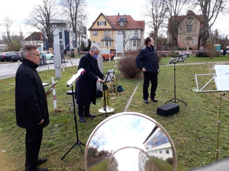 Wege zu finden, um Musik zu den Menschen zu bringen, ist in Zeiten der Kontaktbeschränkungen nicht einfach, aber möglich. Musik überwindet große Entfernungen, musizieren kann man in nahezu jeder Lebenslage, Zuhörer finden sich unter jedem Fenster. Im Frühjahr begannen wir MusikerInnen des MDR-Sinfonieorchesters im Rahmen von kleinen Minikonzerten im Freien Musik zu den Menschen im Sendegebiet „zu liefern“, als #mdrLiederlieferdienst, worüber wir bereits ausführlich berichteten. Mit dem neuen Lockdown im November kam die Frage nach der Möglichkeit auf, diese Konzerte auch in der kalten Jahreszeit fortzuführen. Naturgemäß kommen dafür nur wenige Instrumentengruppen infrage, allen voran die Blechbläser, deren Instrumente auf Kälte und Nässe kaum reagieren und die in all den Jahren von Türmen und auf Weihnachtsmärkten bliesen. Aber auch andere Instrumentengruppen machten sich Gedanken, wie sie im Freien ihre empfindlichen Instrumente schonen, aber dennoch spielen könnten. Als wettertaugliche Variante fanden sich noch ein Cello aus Carbon sowie zwei Flöten aus Kunststoff. Im Adventskalender von mdr-Jump wurden zwei Konzerte verlost, worauf es über 1000 Bewerbungen gab. Zwei Ensembles aus mdr-SO-MusikerInnen konnten die glücklichen Gewinner aus unserem Sendebiet musikalisch beschenken.
