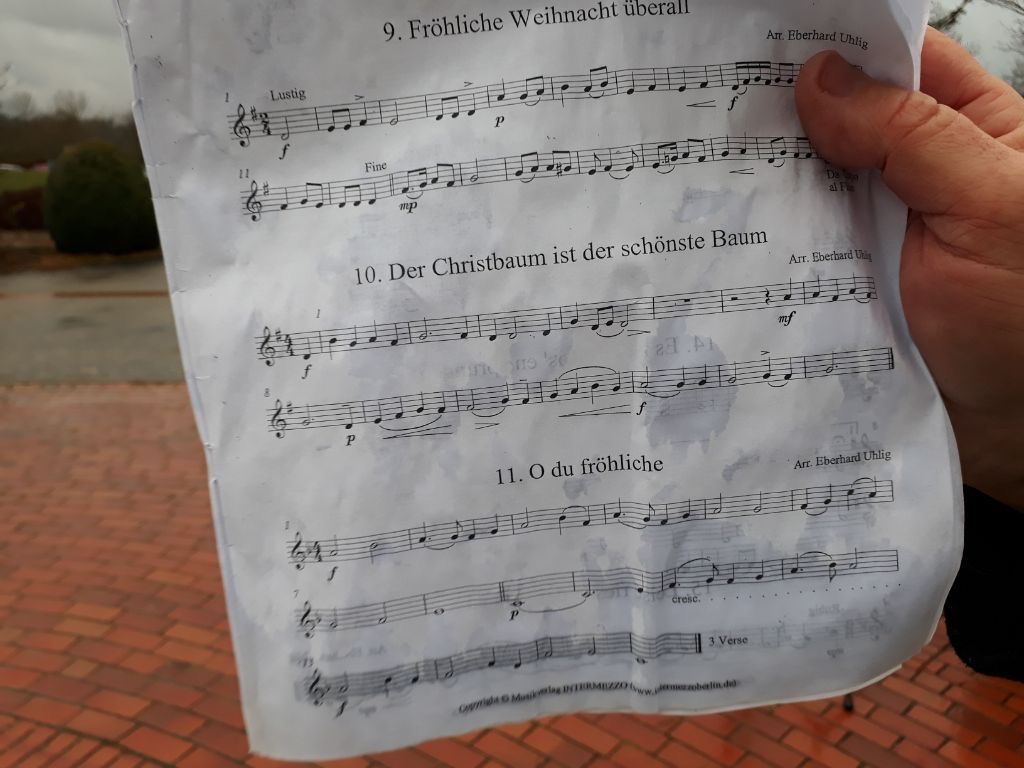 Mit straffem Blick aufs Navi und über Schlaglochpisten durch einsame Waldgebiete im Norden Sachsen-Anhalts war es Nachmittag geworden und vor uns tauchten zwei große weiße Gebäude der Median-Klinik auf. Die Tochter einer Pflegerin hatte Glück beim Losen im MDR-Jump Adventskalender. Sie wollte ihrer Mutter auf diese Art und Weise ihre Bewunderung darüber ausprechen, dass sich ihre Mutter – selbst Risikopatientin und mit großer Angst vor eigener Ansteckung – trotzdem und unermüdlich um zahlreiche an Covid19 erkrankte Patienten in dieser Klinik kümmert. Beste Wetterbedingungen für ein Freiluftständchen waren auch gegeben: starke Windböen und Regen! Unser erstes Lied war auch gleichzeitig unser kürzestes. Es war genau 2 Takte lang, dann waren die Noten im Gebüsch… Uwe Gebel, unser Posaunist, moderierte in seiner anmutigen Art und Weise diese Situation angemessen weg und mit unseren Füßen festgehaltene Notenständer und einarmigen Spiel schafften wir es trotzdem, Weihnachtslieder erkennbar gegen die Klinikmauern zu schmettern und die Beschenkte und zahlreiche andere Pfleger/innen und Ärzte sichtlich zu erfreuen. Eine weitere LLD Station wäre danach nicht mehr möglich gewesen, die Noten hatten ihren letzten Einsatz.