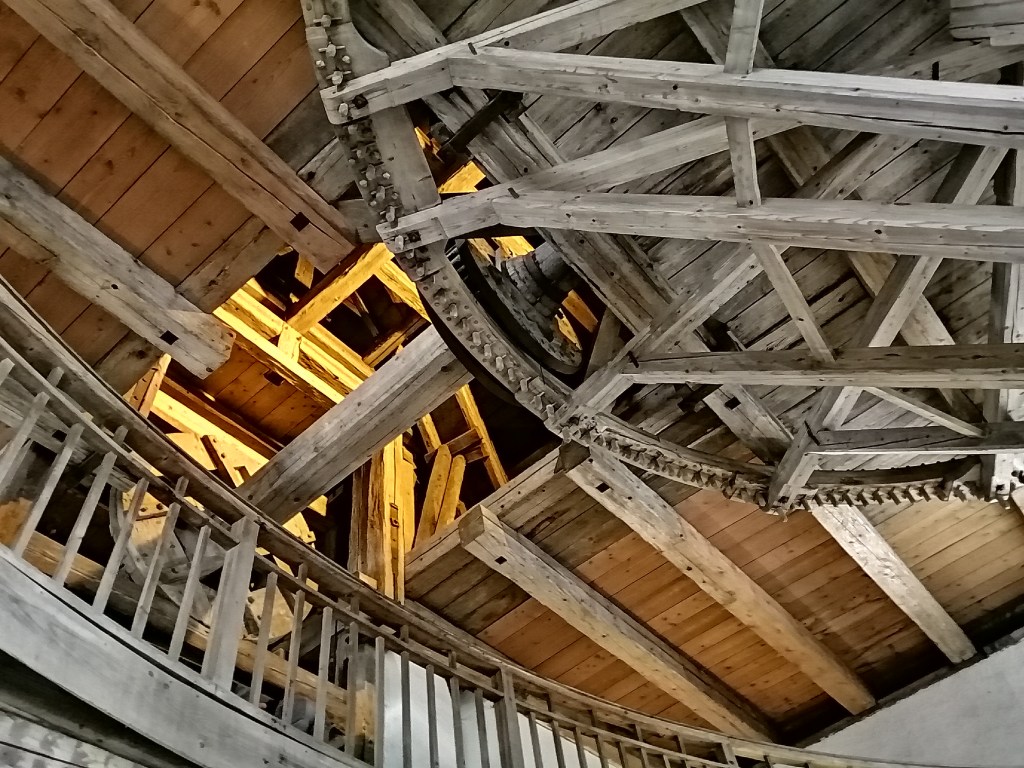 Mich interessierte besonders das Brunnenhaus mit seiner Technik. Das Wasser kam aus 136 m Tiefe auf die Burg und musste aufwändig in Behältern aus dem Brunnen gezogen werden, am Tag etwa 12.000 Liter. Erst, als die Augustusburg ans städtische Wassernetz angeschlossen wurde, war der Brunnen nicht mehr für die Wasserversorgung nötig, aber besichtigen kann man ihn immer noch. Er könnte heute auch noch genutzt werden, denn Wasser ist immer noch drin. Aber man muss dieses ca. 75 m hochziehen. Das wurde uns veranschaulicht, indem Wasser nach unten gegossen wurde. Es dauerte 7 Sekunden, ehe es auf den Wasserspiegel traf. Die Geschichte des Brunnens ist interessant. Ertappte Wilddiebe mussten ihn in den harten Felsen schlagen. Das war sehr schwere Arbeit und sie mussten die ganze Woche unten bleiben und durften nur sonntags zum Gottesdienst nach oben kommen. Viele hielten das nicht lange aus, denn im Brunnenschacht herrschte stickige Luft. Im Brunnenhaus kann man auch einen Film zur Geschichte des Brunnens und des Brunnenhauses, das später als der Brunnen gebaut wurde, sehen.