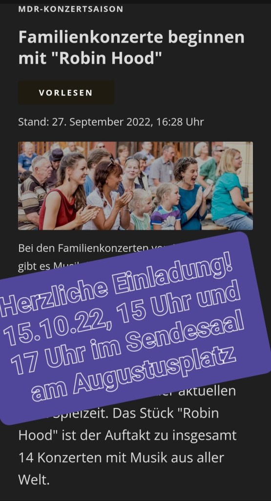 Heute möchten wir wieder eine Einladung an Sie, liebe mdr-Orchesterfreunde, weitergeben, diesmal von Komponist und mdrSO-Bratscher Sebastian Hensel. In den Familienkonzerten am 15. Oktober 2022 im Orchestersaal des MDR-Würfels am Augustusplatz in Leipzig wird sein „orchestrales Abenteuer Robin Hood“ unter der musikalischen Leitung von Claudio Novati vom MDR-SINFONIEORCHESTER und der Schauspielerin Victoria Findlay für Zuhörer ab 10 Jahren erzählt.