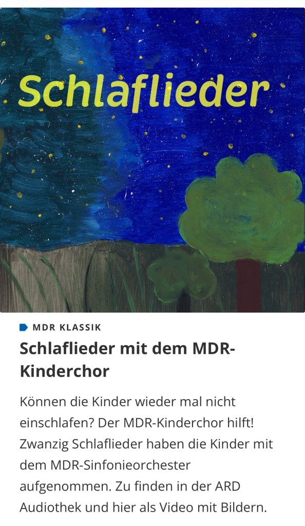 Ebenfalls neu erschienen sind 20 Schlaflieder mit dem MDR-Kinderchor. Auf der Website von MDR KLASSIK stehen verschiedene Möglichkeiten zum Anhören, Anschauen und Mitsingen bereit. (Wir hoffen, dass der Link lange bestehen bleibt.)