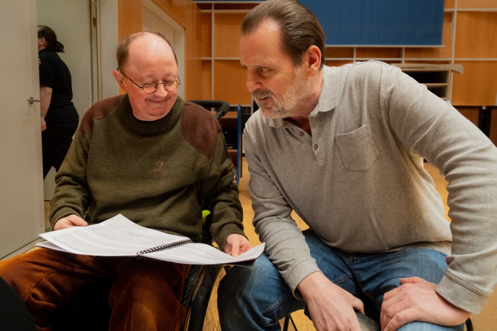 Ulrich Stiehl, selbst Betroffener der Lebenshilfe, hat sich musikalische Gedanken zu dem Thema Inklusion gemacht und in Zusammenarbeit mit Gerd Fischer, Trompeter im MDR-Sinfonieorchester, eine Partitur für großes Orchester erstellt, die morgen erstmals im Konzert erklingen wird. Titel des Stückes ist Inklusion mit Musik. Herr Stiehl war bei den Proben im Orchestersaal im MDR-Würfel dabei und strahlte von Probe zu Probe mehr.