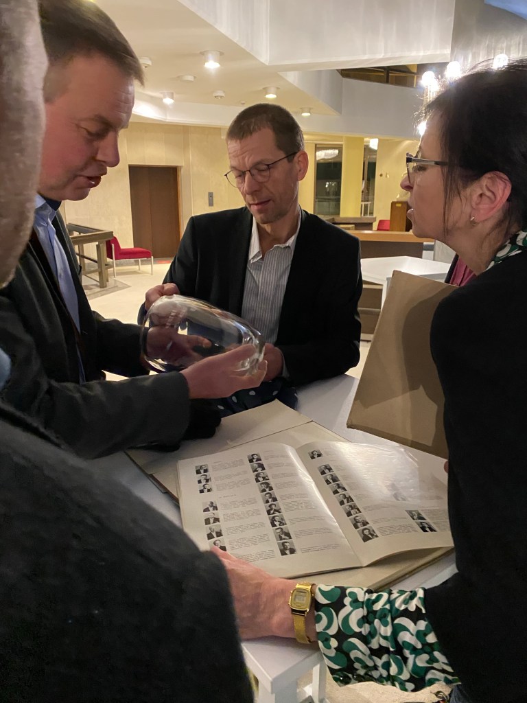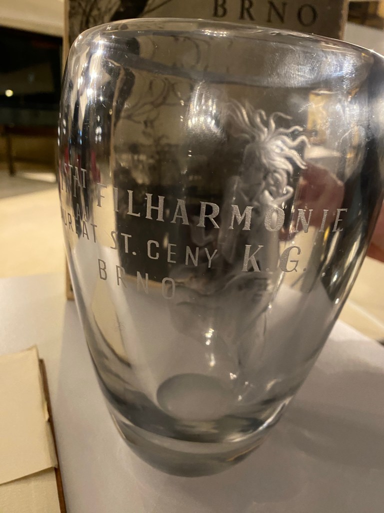 In unserem Archiv hatten wir zuvor wirklich etwas besonderes gefunden: einen Pokal des damaligen tschechoslowakischen Staatspräsidenten und ein Buch mit Widmung von der Staatlichen Philharmonie Brünn aus Anlass eines Konzertes unseres Orchesters in Brünn im Jahre 1957.