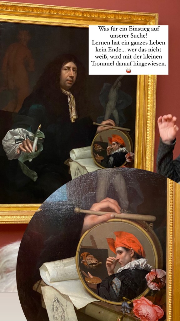 Gleich zu Beginn gab es einen wunderbaren „Aufhänger“ oder Impuls: ein Selbstbildnis von Johannes von Wijkersloot mit vielen Details, da ist zum Beispiel das Lebenslicht, das immer weiter abbrennt, umrahmt von merkwürdigen Utensilien in der grazil gemalten Hand, aber auch auf der anderen Seite der auf einer kleinen Trommel abgebildete, sich an die Nase fassende Spielmann vor dem Schafskopf auf der Staffelei, den er gerade malt… allein vor diesem Gemälde könnte man schon eine gute Zeit verweilen, um die Gedanken schweifen zu lassen.