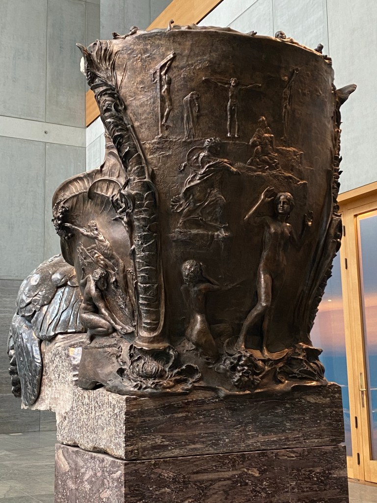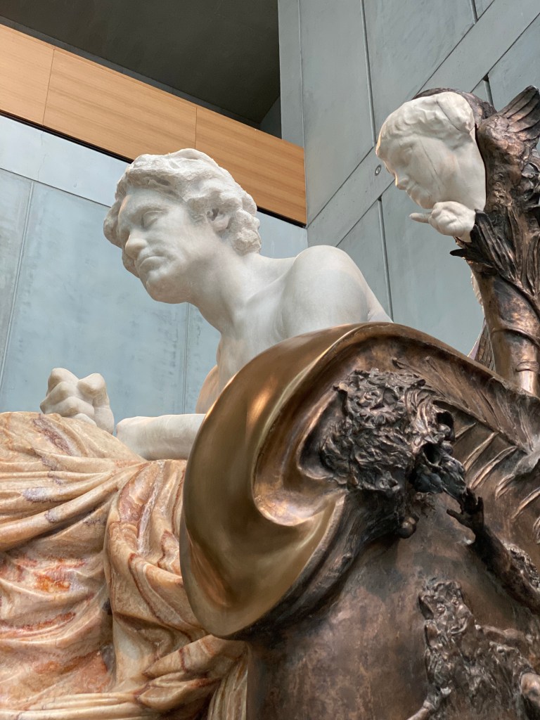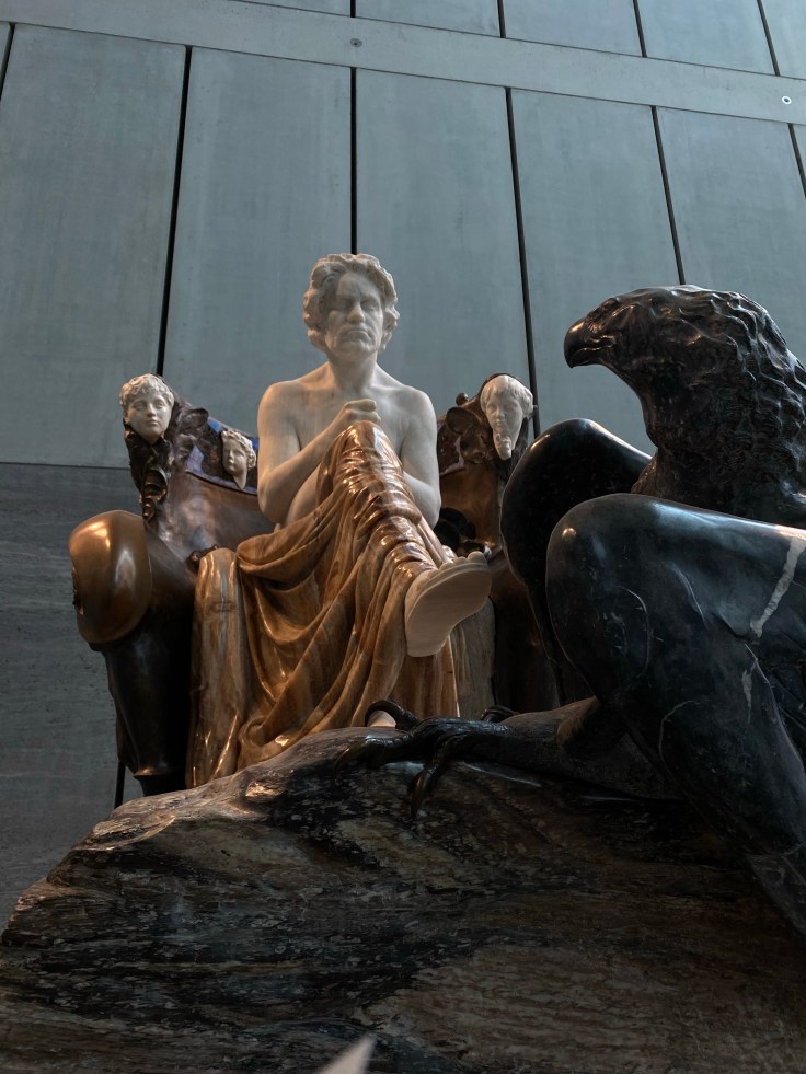Schon im öffentlichen Vorraum des Foyers erwartet uns dort bekanntlich Max Klingers 12 Tonnen schwerer Beethoven, der voll Wut und Verbitterung als nacktes Idol mit geballter Faust und den Musen im Rücken seine trotzige Beharrlichkeit ausdrückt, die uns bis heute in seiner Musik fasziniert.