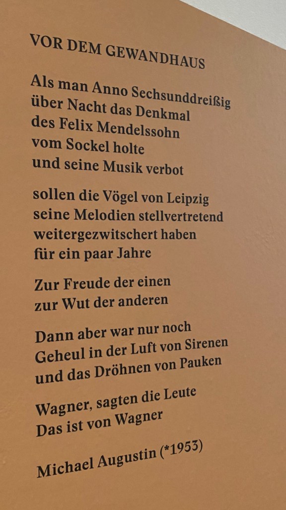 Die derzeitige und noch bis 20.8.2023 zu sehende Ausstellung widmet sich dem Thema #HakenkreuzUndNotenschlüssel und zeigt Persönlichkeiten der Musikstadt Leipzig im Nationalsozialismus, die sich mit der systematischen Gleichschaltung des musikalischen Lebens arrangieren mussten, die Reglementierung des gewachsenen Musiklebens der Stadt zu spüren bekamen. So wurden Spielpläne diktiert und missliebige, unerwünschte Komponisten samt ihren Denkmälern entfernt, jüdische Musikverleger und Musiker wurden gezielt vertrieben und vernichtet, die Geschichte der „Musikstadt Leipzig“ im Sinne der Nationalsozialisten fortgeschrieben, von allem „Nicht-Arischen“ erbarmungslos „gesäubert“. Es gab Profiteure, aber auch stramme „Diener“ des Systems. In neun Kapiteln widmet sich die Ausstellung erstmalig der Aufarbeitung dieser Zeit. Sehr sehens- und empfehlenswert!