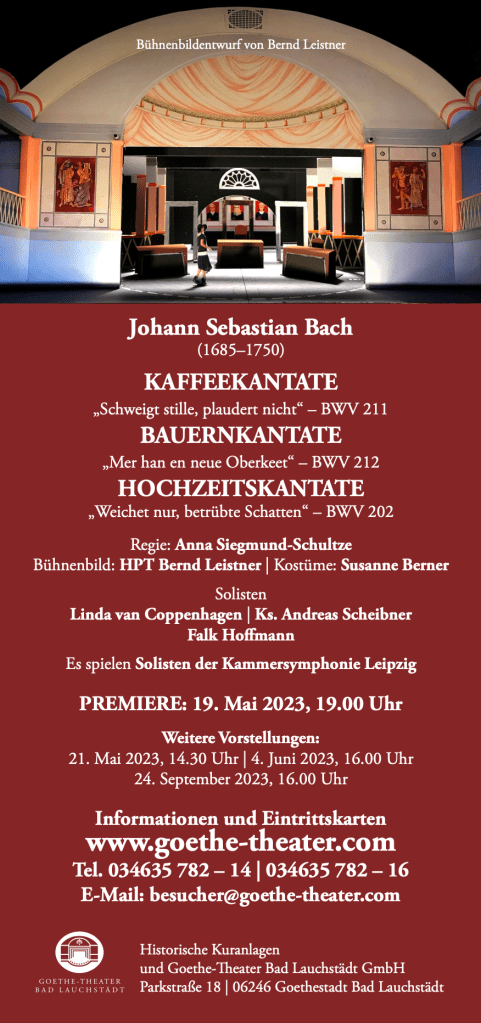Am Sonntag, dem 24. September ’23 gibt es um 16:00 Uhr im Goethetheater Bad Lauchstädt eine Wiederaufnahme der Bachkantatenproduktion vom Frühjahr dieses Jahres.