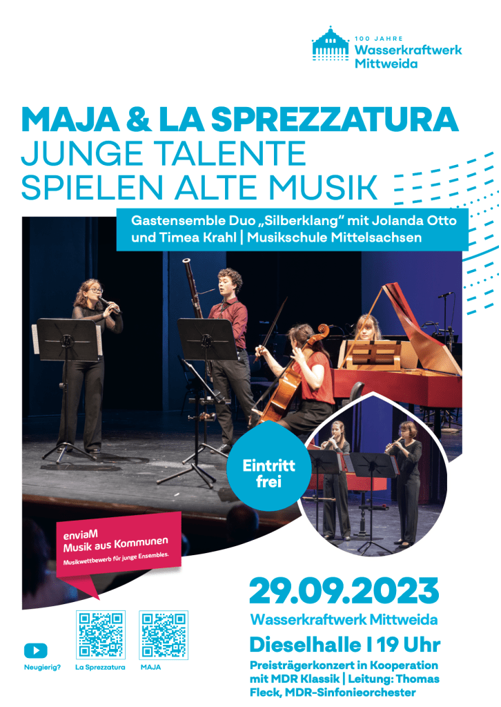 Das Konzert mit Preisträger*innen des enviaM-Musikschulwettbewerbes MUSIK AUS KOMMUNEN im Wasserwerk Mittweida findet am 29.09.2023 um 19 Uhr in der Dieselhalle des Kraftwerks im Rahmen der Feierlichkeiten „100 Jahre Wasserkraftwerk Mittweida“ statt. Der Eintritt ist kostenfrei.