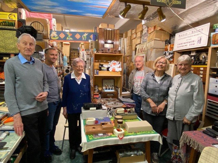 Ich (Susanne Schneider) hatte das Glück, in einer wahren Expertengruppe mitzulaufen. Frau Kretzschmann und Frau Rühlemann waren beide früher Tonmeisterin bzw. Toningenieurin beim Mitteldeutschen Rundfunk, ich selbst erlebte sie noch vor Kurzem in Aktion bei Aufnahmen mit dem MDR-Sinfonieorchester. Nun sind beide im Ruhestand oder besser gesagt im „Unruhestand“, denn sie sind als mdr-Orchesterfreundinnen sehr interessiert am weiteren Orchesterleben und natürlich auch an der Geschichte des Senders und der dazugehörigen Technik. Mit von Partie und auf dem Bild waren auch eine weitere ehemalige Kollegin sowie zwei Herren, die sich sehr gut in Radiotechnikdingen auskannten und leidenschaftliche Sammler sind. Während ich staunend-interessiert zwischen all den mir größtenteils unbekannten Dingen stand und lauschte, entspann sich eine rege diskutierte Reise in die Vergangenheit… dankenswerterweise setzt nun Frau Evelyn Rühlemann den Bericht fort.