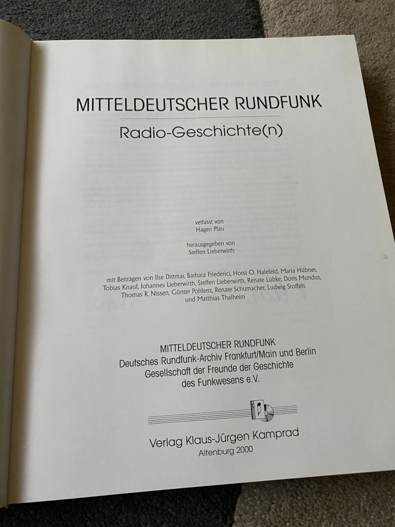Einen Buchtipp möchte ich noch anschließen: Im Jahr 2000 erschien im Verlag Klaus-Jürgen Kamprad das Buch „Radio-Geschichte(n)“, verfasst von Hagen Pfau, herausgegeben von Steffen Lieberwirth mit sehr vielen Beiträgen rund um die Geschichte und die Geschichten des Rundfunks. Leider ist es nur noch antiquarisch erhältlich, aber ich hatte Glück und packte vor wenigen Stunden beglückt ein Exemplar aus. Ein erstes Durchblättern verspricht viele interessante Lesestunden.