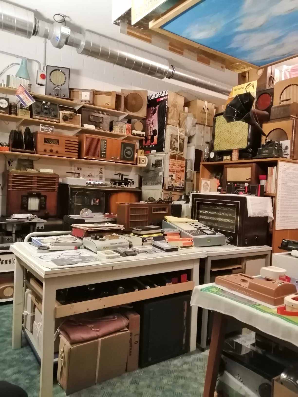 Nach einem fantastischen Vormittag, der uns weit zurück in die Radiogeschichte führte, hatte uns das Tageslicht am Mittag wieder. Fünf Sitzgelegenheiten gibt es im Magazinkeller, also durften nur kleine Grüppchen zu 5 Personen kommen, drei Termine gab es bisher, weitere kann es wahrscheinlich geben, da die Nachfrage groß war, aber es terminlich nicht für alle passte. Sollten Sie sich anschließen wollen, treten Sie gern mir uns in Kontakt, wir fragen bei Herrn Pfau gern nach weiteren Terminen. Er signalisierte uns, dass es auf Anfrage möglich ist.