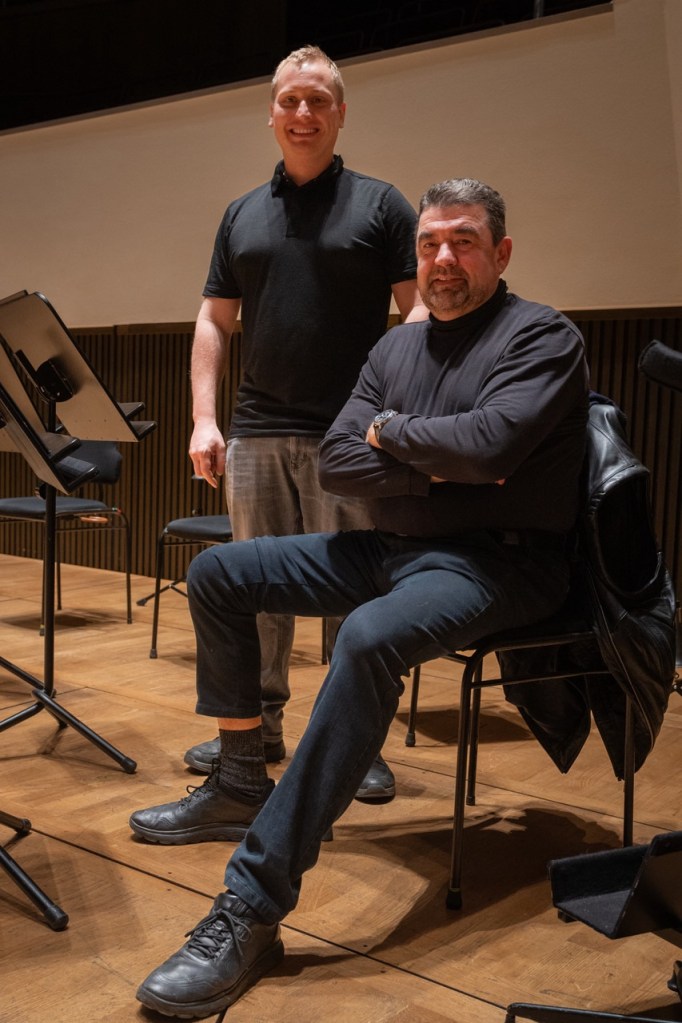 Zuerst sind Christian Dinu (Instrumentenwart) und die Chor- und Orchesterwarte da (im Bild mit Bühnenmeister Florian Kothe). Sie bauen die Bühne auf, mit Stühlen, Notenpulten, Dirigierput und natürlich den Noten.