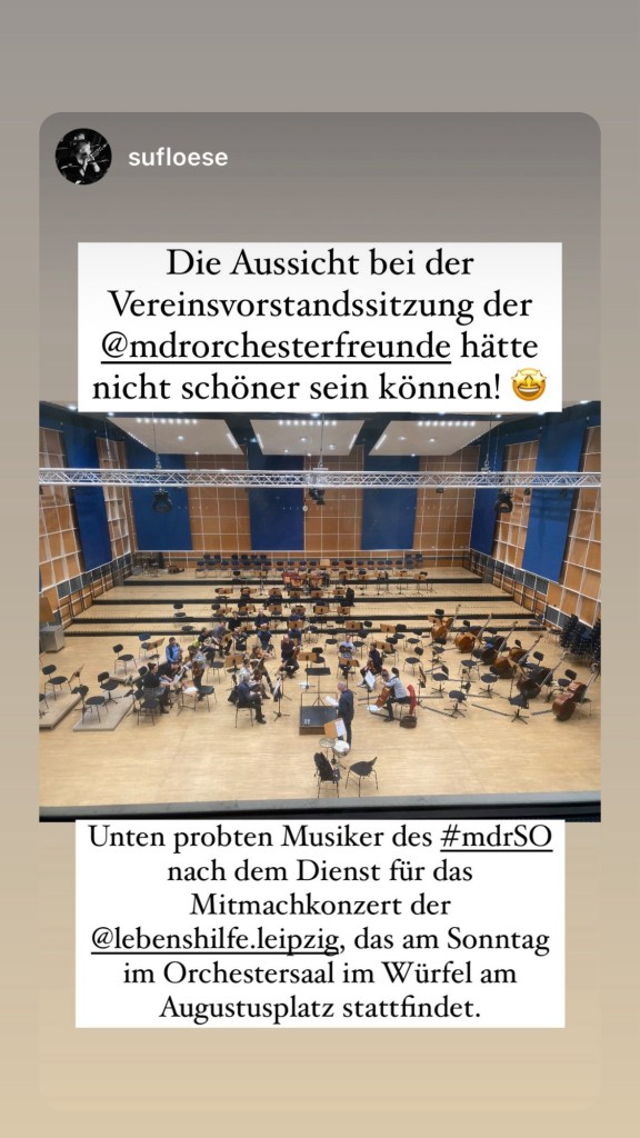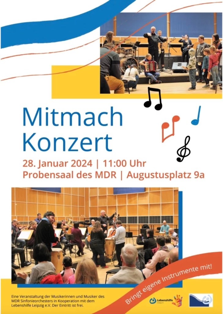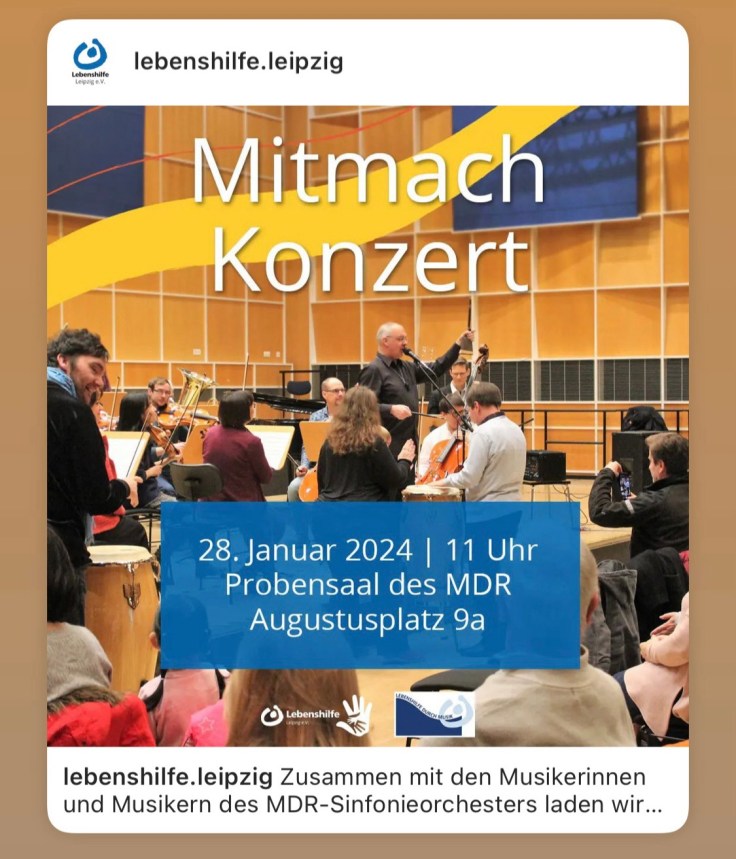 Am Sonntag fand wieder ein Mitmachkonzert der mdr-Musiker:innen im Rahmen der Patenschaft mit der Lebenshilfe Leipzig e.V. „Lebenshilfe durch Musik“ im Orchestersaal des Würfels am Augustusplatz statt. Auch dazu hier ein kurzer Bericht und einige Fotos: