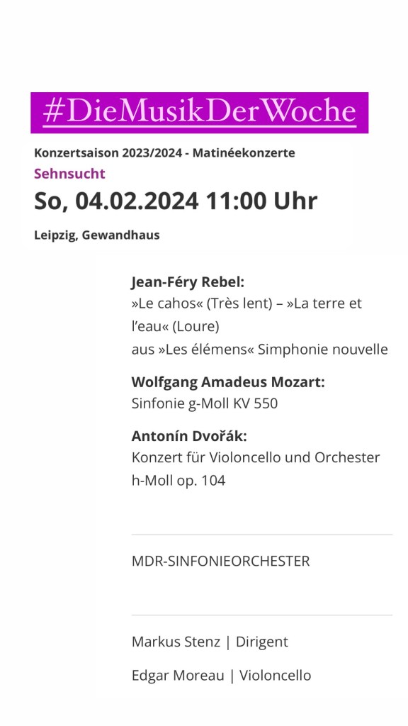 Am kommenden Sonntag, 4.2., erwartet Sie im Gewandhaus ein Matineekonzert mit dem Cellisten Edgar Moreau und Markus Stenz, der das MDR-SINFONIEORCHESTER erst durch ein für seine Zeit unerhörtes Chaos steuert (eine barocken Komposition von Jean-Féry Rebel) und dann mit Mozarts berühmter g-moll-Sinfonie und dem Dvorak-Cellokonzert aufwartet.