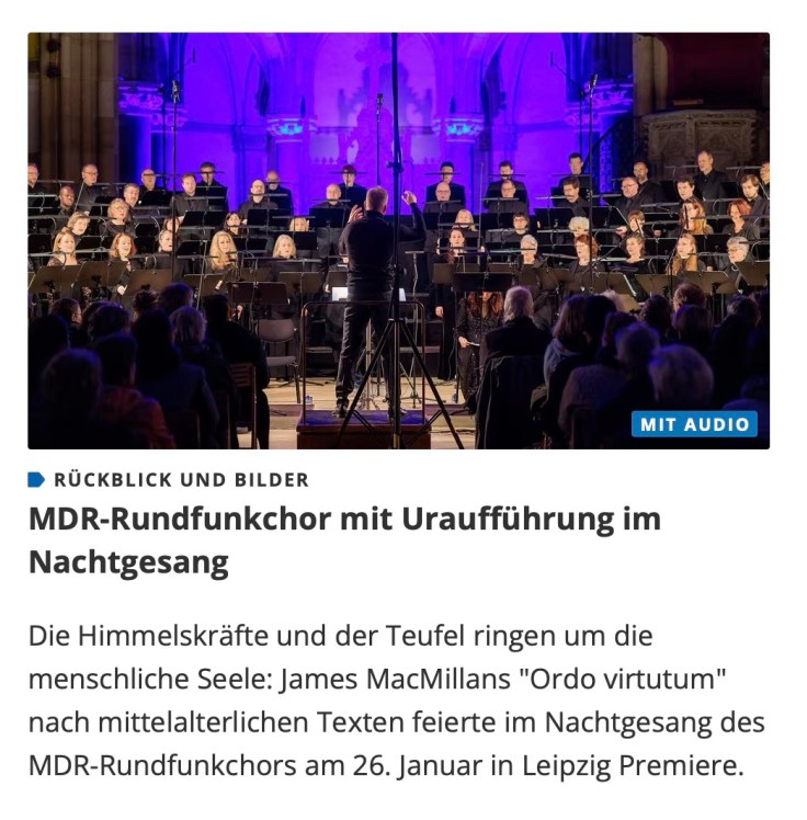 Den Auftakt machte bereits im Januar ein besonderer Nachtgesang des MDR-Chores: Die Auftragskomposition Ordo virtutum von James Mac Millan wurde in der Leipziger Peterskirche uraufgeführt.