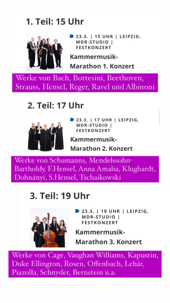 Nun folgen eine Reihe von großen Konzerten im Leipziger Gewandhaus, Chormusik zur Buchmesse und ein Filmmusik-Konzert im CCS in Suhl. Ein weiteres Highlight zum Abschluss der Festwochen: der Kammermusik-Marathon am 23. März im MDR-Studio am Leipziger Augustusplatz!