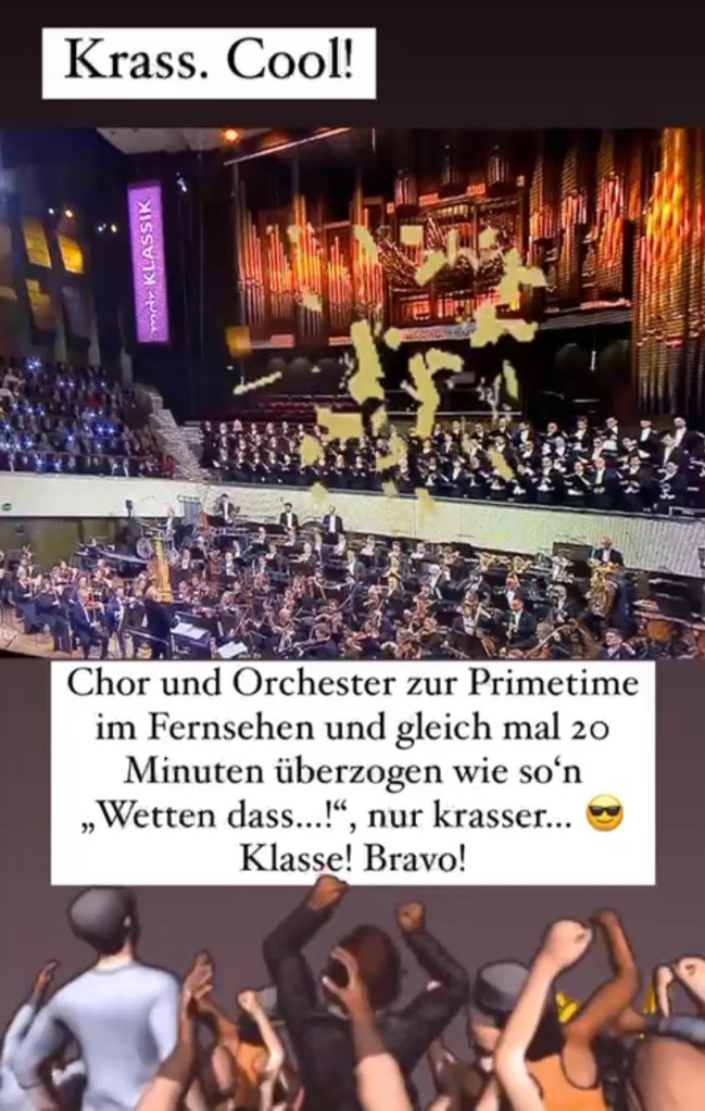 Krass. Cool. Die #mdrEnsembles zur Primetime im Fernsehen, der Saal war voll und es wurde gleich mal 20 Minuten überzogen wie so‘n „Wetten dass…“! Sehr kurzweiliger und lustiger Abend. Bravo tutti! (Wie ich persönlich den Abend am Fernseher erlebte… ich hatte keinen Dienst.)
