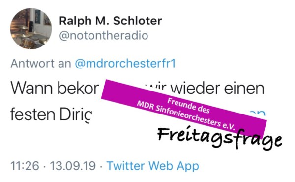 Heute gibt es eine mdr-Orchesterfreunde-Frage, die vor einer Woche von einem unserer Twitter-Follower gestellt wurde: Die Frage reichen wir gern an den Hauptabteilungsleiter von MDR Klassik, Herrn Heiner Louis weiter, denn auch uns interessiert die Antwort brennend: Wann bekommen wir wieder einen festen Dirigenten? Herr Louis: Als Kristjan Järvi uns mitteilte, dass er seinen Vertrag... Continue Reading →